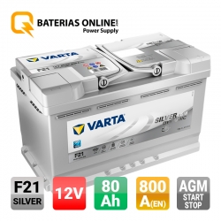 A Bateria Varta f21 da série Silver Dynamic AGM tem uma capacidade de 80Ah com uma potência de arranque de 800A. Suas medidas são: 315x175x190 mm. É uma bateria de arranque e é utilizado em veículos com sistemas avançados START-STOP com recarga com sistema de travagem regenerativa.